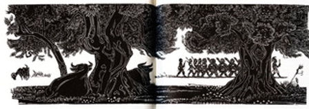Odysseus kommt in der Gestalt eines Bettlers zurück nach Ithaka. Auch seine Frau Penelope erkennt ihn nicht. Er muss zuerst die Freier am Hofe überwältigen. Es fliesst viel Blut. Verständlich, dass Emil Zbinden das Kapitel eingangs mit einem Harnisch illustriert und mit einer doppelseitigen Soldatenszene beendet. Man beachte den Krieger, mit dem Zbinden die Marschkolonne abschliessen lässt.